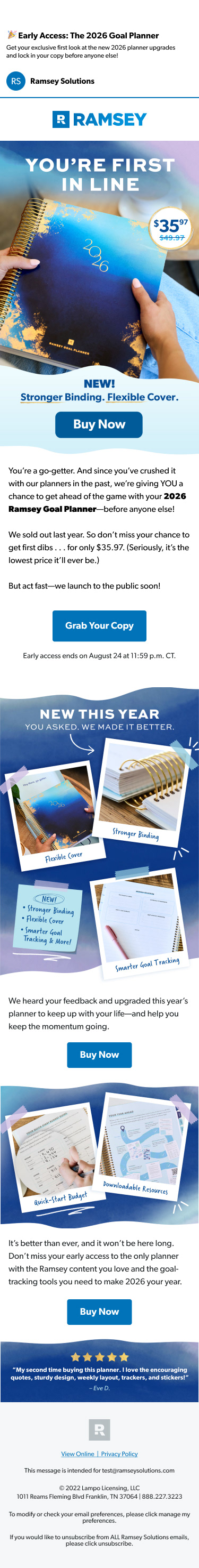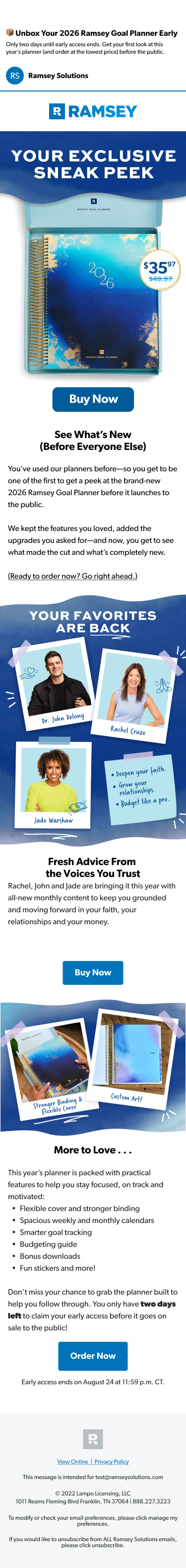 Partnered cross-functionally with marketers and external vendors to execute product materials and ensure production quality. In addition to the product design, developed cohesive marketing assets including launch emails, paid social ads, The Ramsey Show lower thirds, and show slates to support a unified, multi-channel rollout.